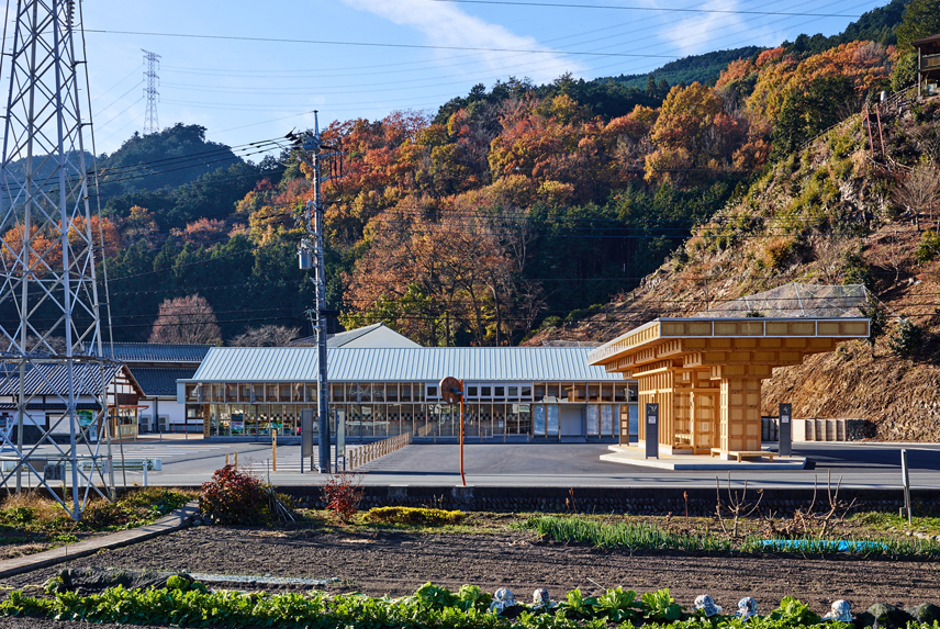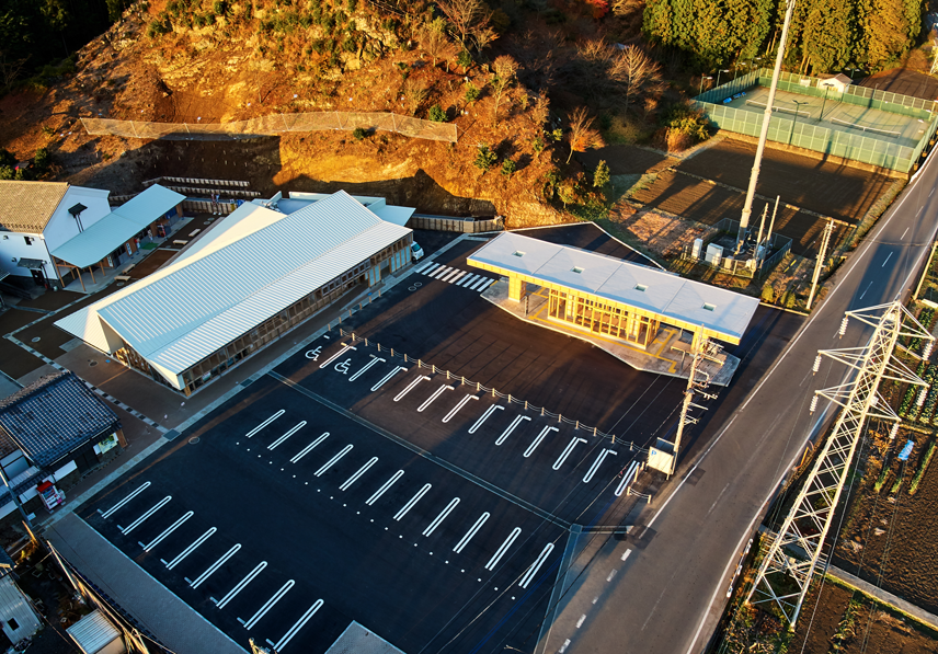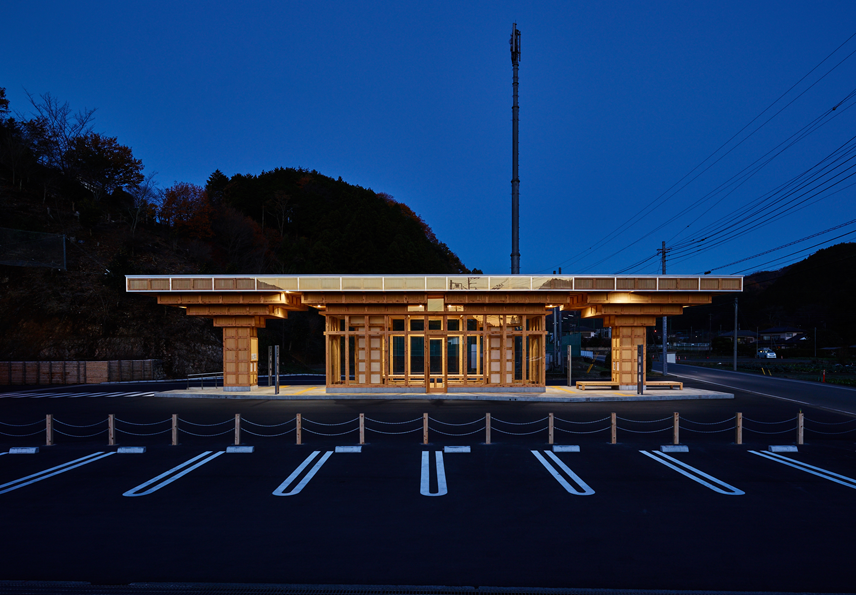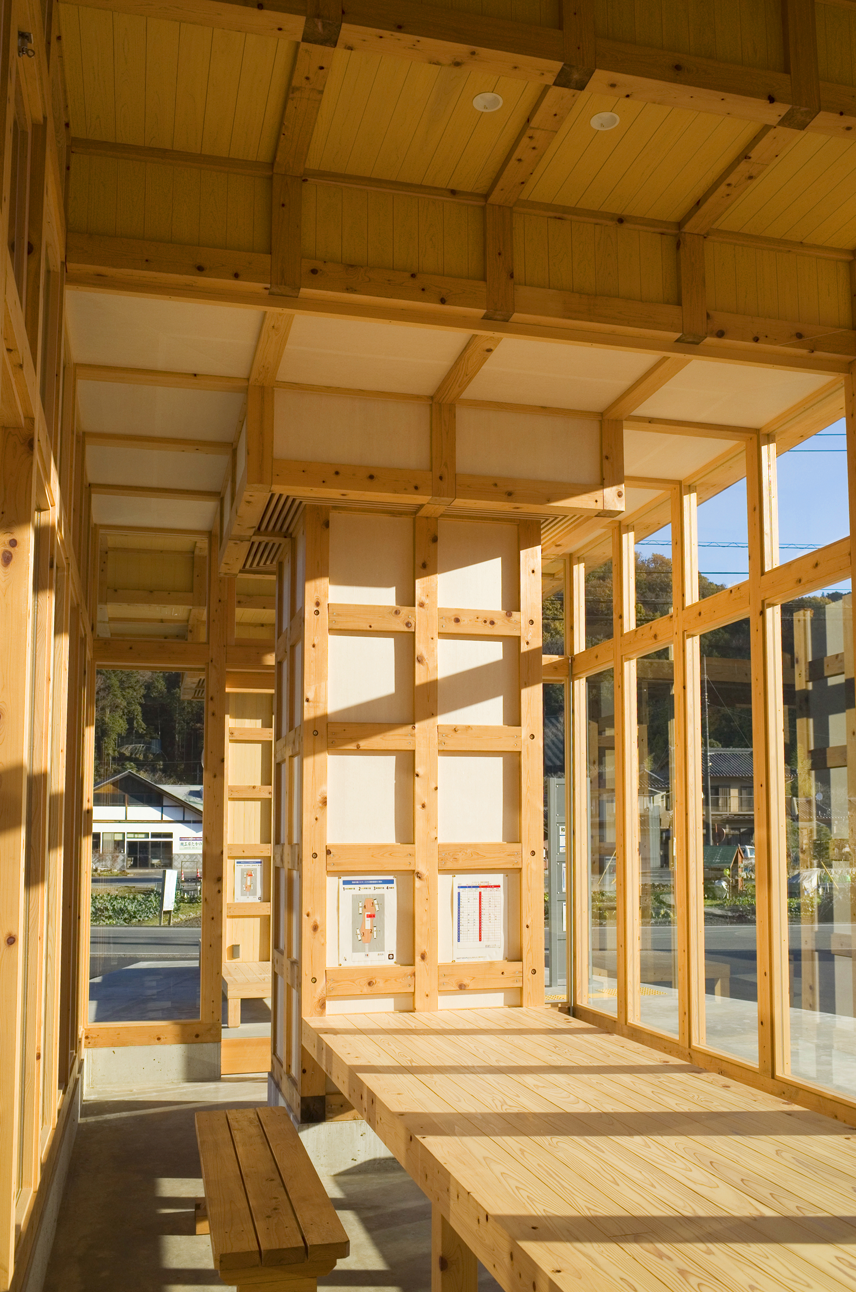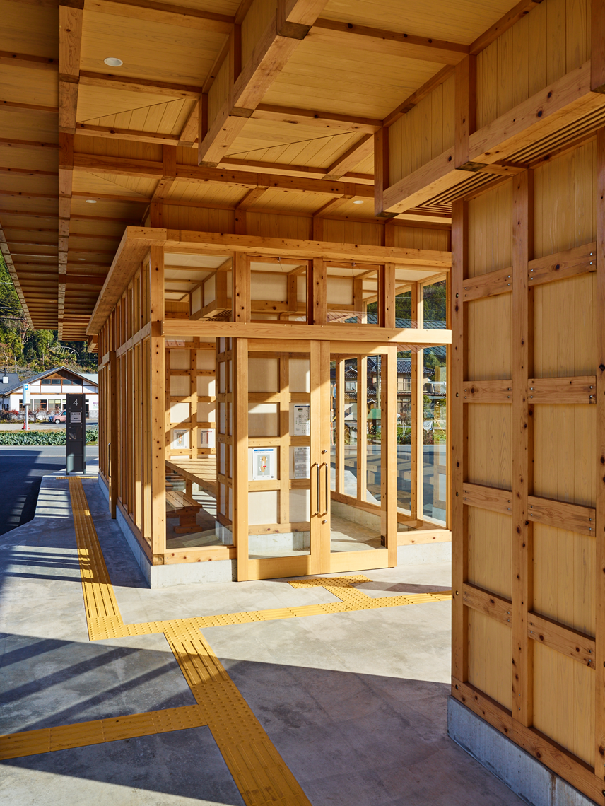 骨組に桧、外壁の仕上げ材に杉、待合室の内装の一部に和紙を用いて、東秩父の歴史的に受け継がれている材料と現代の技術が共に反映されいる建物になっています。