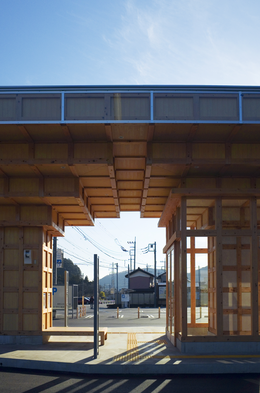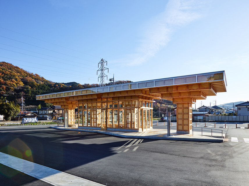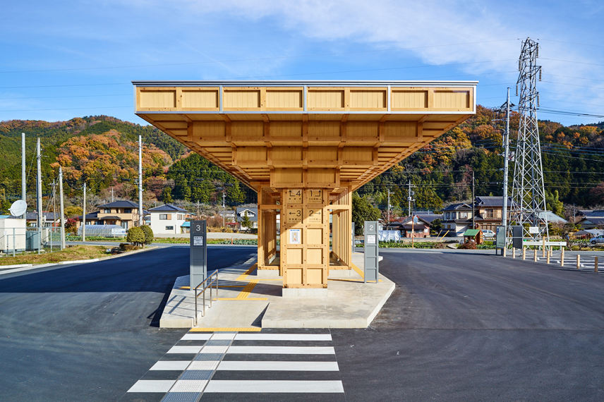 和紙漉きの道具「簀桁(すけた)」を積み重ねたような、村産材の檜・杉・和紙を用いた温もりのある木製のバスターミナルです。