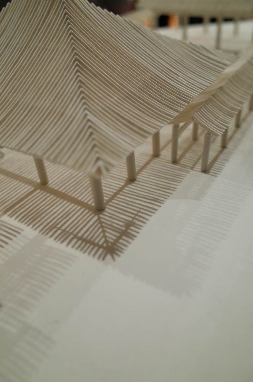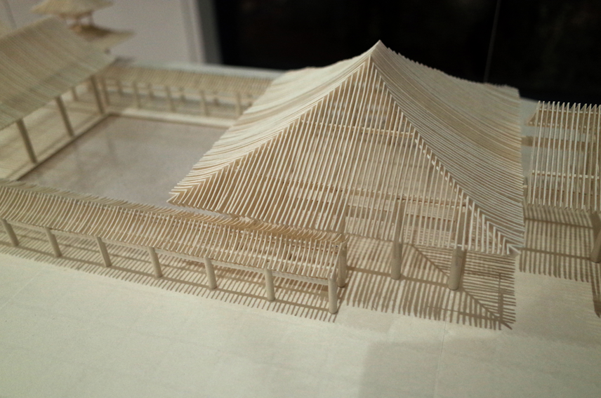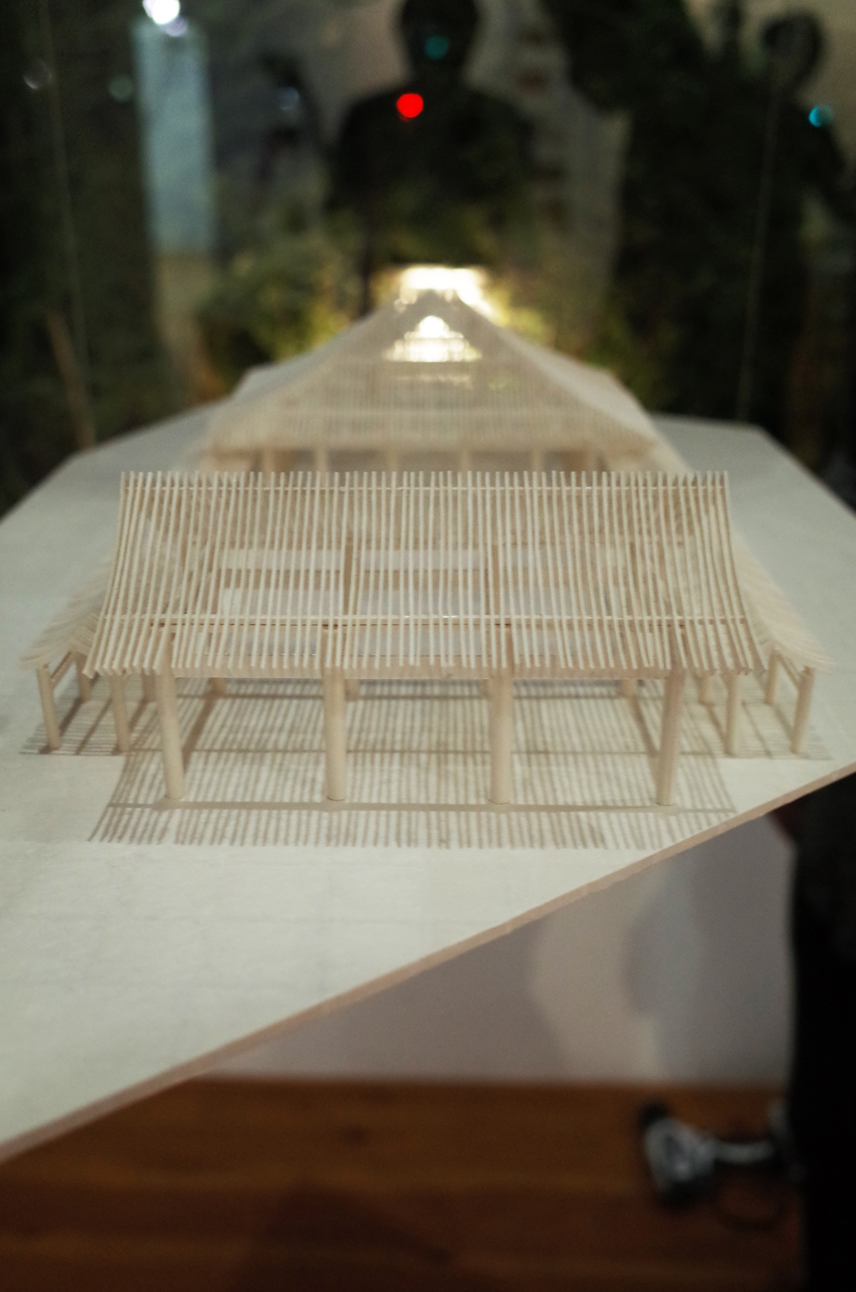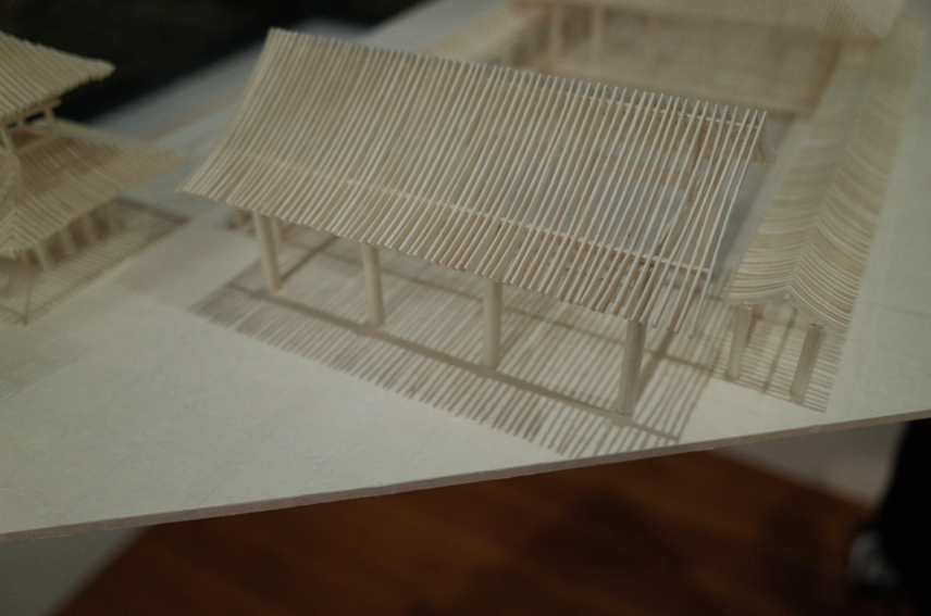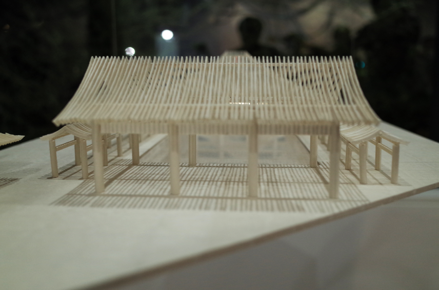 本院の瓦屋根を細い格子状に置き換えることで、和紙の繊細さを持ちつつ、全体として存在感のある模型に仕上がりました。照明に照らされた繊細な和紙の建物と、下に落ちる影がとっても綺麗で、P3の方々、松野所長と一緒に考えていたことが表現できたと思っています。